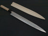 Hand-forged by legendary blacksmith Yoshikazu Tanaka in Sakai, with Shirogami (White) #2 steel. This large (and tall) carbon yanagiba is supplied with timber saya and magnolia handle.